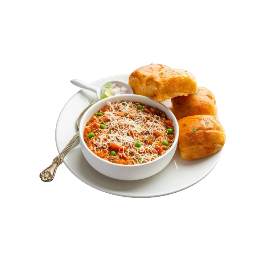 A Mumbai street food favorite — mashed mixed vegetables cooked in a special buttery spice blend, served with toasted pav (bread rolls) and chopped onions.