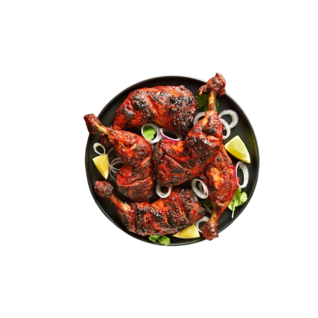 Juicy chicken marinated in yogurt and traditional tandoori spices, slow-cooked in a clay oven to achieve a smoky, charred flavor and tender texture.
